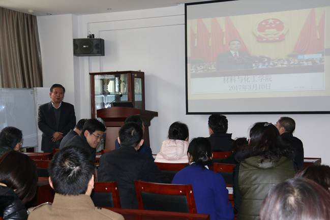 会议伊始,党委书记路金龙宣读了习近平总书记在全国高校思想政治工作会议重要讲话精神,路书记强调,广大教师必须坚持正确政治方向,高校是中国特色社会主义高校,高校立身之本在于立德树人,要用好课堂教学这个主渠道,协调思想政治教育同步进行,全方位育人。高校教师要明道、信道,努力成为先进思想文化的传播者、党执政的坚定支持者。坚持四个“相统一”,以德立身、以德立学、以德施教。然后,党委副书记张治宏带领大家学习了李克强总理在十二届全国人大五次会议上作的政府工作报告。最后,院长坚增运作总结发言,并强调在工作之余,要关注“两会”动态,关注国家发展,在自己的工作岗位上为国家发展多做贡献。