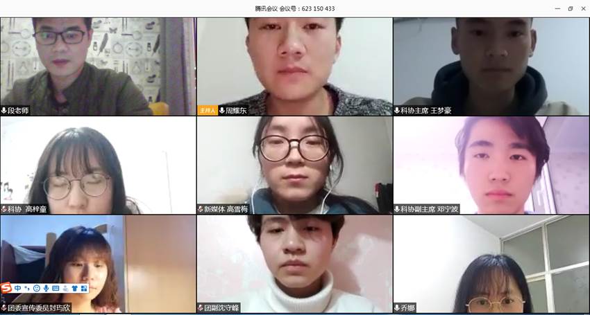 会议开始,首先段强老师着重强调团学干部应尽快调整进入工作状态,按工作计划着手开展各项活动,并要求各团学组织及时反馈工作开展情况,为开学之后团学工作的有序开展奠定基础。此外,段强老师对近期各团学组织的工作进行了任务分配。根据工作环境变化,团学工作任务和形式也做了相应调整。随后,乔娜老师对团学工作的开展进行了补充说明,她指出疫情期间的团学工作要围绕“共抗疫情 爱国力行”主题,紧密结合“青春告白祖国”系列活动,坚持作品原创,创新活动形式,吸引并鼓励广大青年学生积极参加,创造积极向上、丰富多彩的网络文化成果,同时发挥好新媒体宣传引导作用,及时推送优质网络文化作品,从而引导青年学生发扬爱国主义精神。其次,各团学组织负责人汇报了本学期的工作计划,并提出现存在的一些工作问题及困惑。段强老师和乔娜老师就存在的工作问题和困惑分别给予了解答。最后,段强老师对本次线上会议进行总结,希望大家在疫情防控期间始终牢记一名学生干部的责任与担当,不忘初心、砥砺前行。