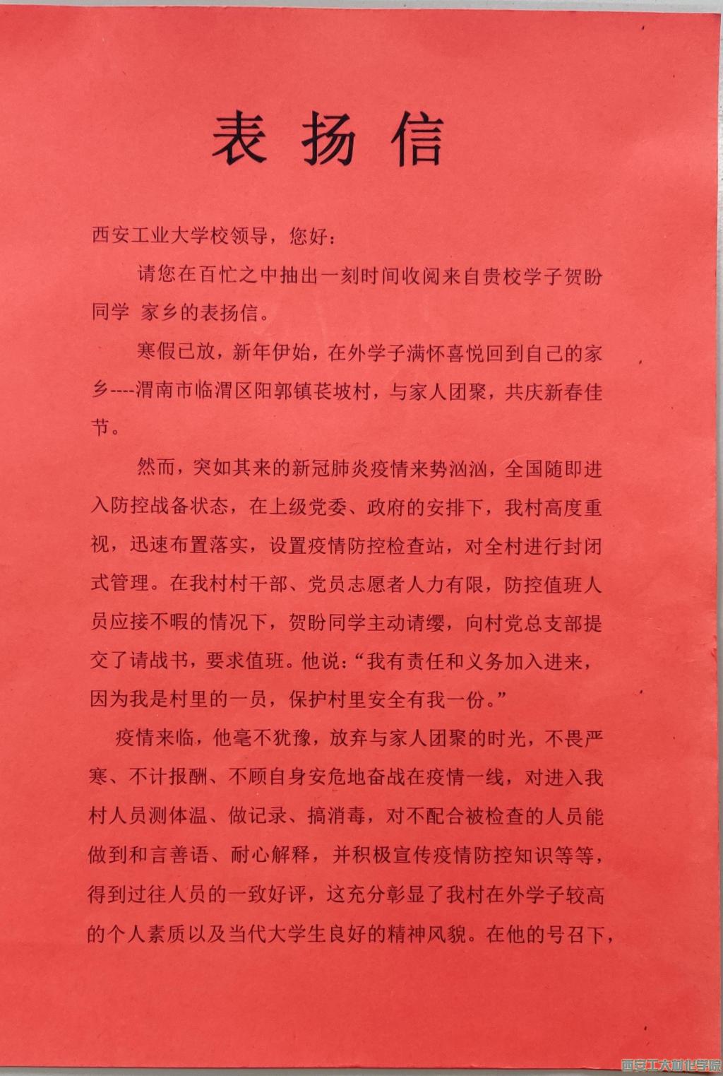 2018级材料化学专业贺盼同学在疫情期间,为当地疫情防控工作贡献青春力量提出了感谢和表扬,并对av女优