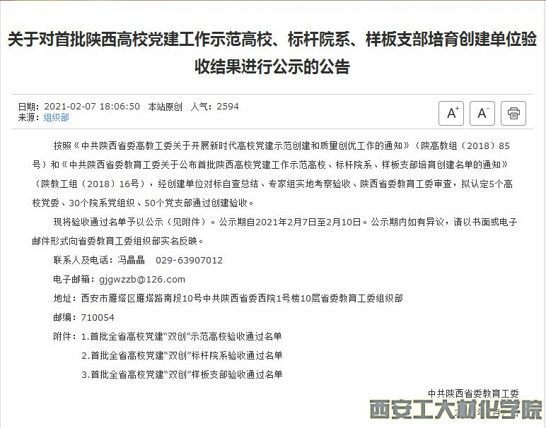 2018年12月,陕西省委教育工委印发《中共陕西省委教育工委关于公布首批陕西高校党建工作示范高校、标杆院系、样板支部培育创建名单的通知》,确定5所高校、30个标杆院系、50个样板支部作为陕西高校党建工作示范高校、标杆院系、样板支部培育创建单位。按照陕西省委教育工委文件明确的验收工作办法,经创建单位对标自查总结、专家组实地考察验收、陕西省委教育工委审查,拟认定5个高校党委、30个院系党组织、50个党支部通过创建验收。
