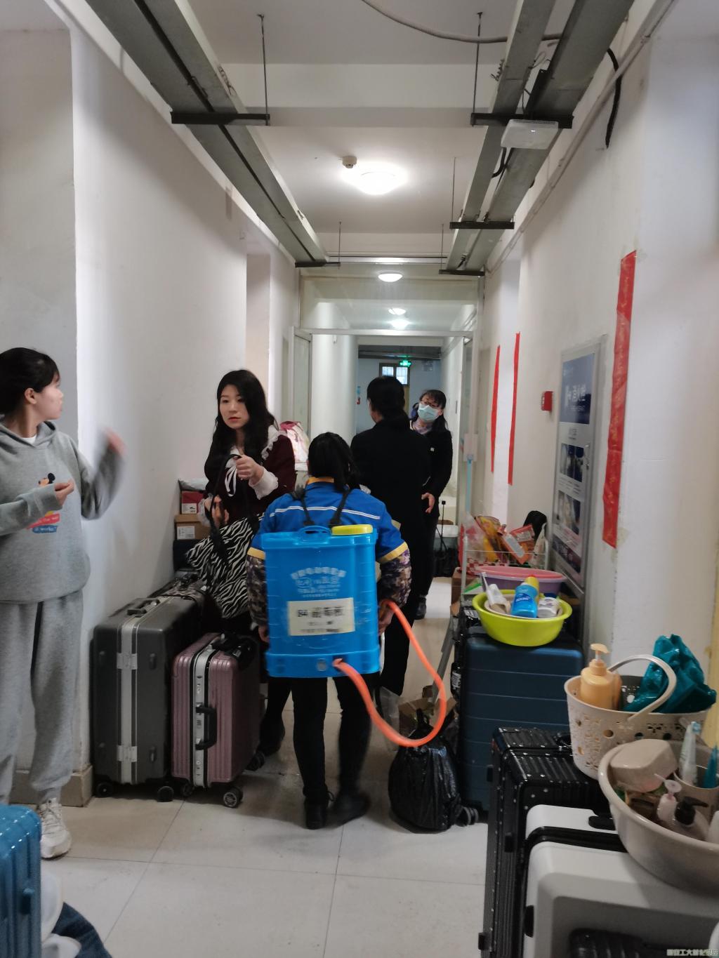 全体辅导员深入宿舍,组织学生认真打扫宿舍卫生,用公寓配制的消毒液擦拭书桌、衣柜和拖地。最后,各年级辅导员督促学生将宿舍内堆放的物品全部清理出宿舍,摆放在楼道内,彻底清理卫生死角,垃圾及时清理出宿舍楼,宿舍打扫完后联系楼管,安排专人对宿舍内进行消毒,学院逐一检查登记,确保清扫一间、消杀一间,不留死角。
