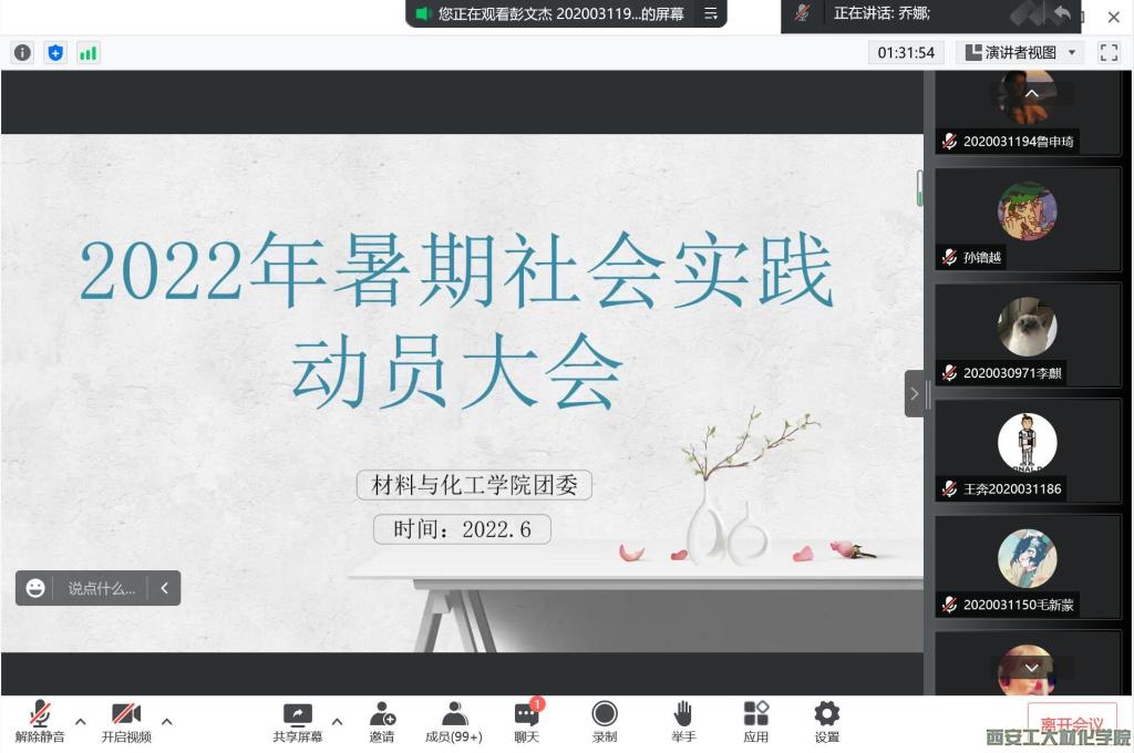 团委于2022年6月16日晚在腾讯会议举行2022年暑期社会实践动员大会。学院团委书记段强、2020级辅导员徐慧子、2019级部分学生及2020级全体学生参加次会议,团委副书记乔娜主持会议。